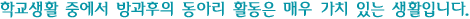 ±×·¯³ª º»±³¿¡¼´Â ¼Ò¼³ ¼Ó À̾߱âÀÇ Çö½Ç¼ºÀ» È®ÀÎÇÒ ¼ö ÀÖ½À´Ï´Ù. Çб³ ¼ö¾÷ÀÌ ³¡³ µÚ ÇлýµéÀÌ Ã౸, ¾ß±¸, °Ëµµ, Å״Ͻº, ¿ÀÄɽºÆ®¶ó, ÄÄÇ»ÅÍ, ÇнÀºÎ µî ¶¡À» È긮¸ç Ȱ¹ßÇÏ°Ô °¢ÀÚÀÇ Ãë¹ÌȰµ¿¿¡ ¿©³äÀÌ ¾ø´Â ¸ð½ÀÀÌ ÀλóÀûÀÔ´Ï´Ù. Àüü Çлý Áß 80%°¡ µ¿¾Æ¸® Ȱµ¿¿¡ Âü°¡ÇÕ´Ï´Ù. Àǹ«ÀûÀÌ ¾Æ´Ï¶ó ÀÚ¹ßÀûÀ¸·Î Âü°¡ÇÕ´Ï´Ù. ¼ö¾÷ÀÌ ³¡³ªÀÚ¸¶ÀÚ ÀÔ½ÃÇпøÀ» ÇâÇØ »Ô»ÔÀÌ Èð¾îÁö°Å³ª ÀÔ½ÃÀÇ Á߾а¨À» ÇØ¼ÒÇϱâ À§ÇØ ÄÄÇ»ÅÍ ¹æ ¶Ç´Â ÀÚ½ÅÀÇ ¹æ¿¡ ó¹ÚÇô ÄÄÇ»ÅͰÔÀÓ¿¡ ¸ôµÎÇÏ´Â Çѱ¹ Çлýµé¿¡°Ôµµ µ¿¾Æ¸® Ȱµ¿ °°Àº ÇØ¹æ±¸°¡ ÀÖÀ¸¸é ÁÁÀ¸¸®¶ó »ý°¢ÇÕ´Ï´Ù. |